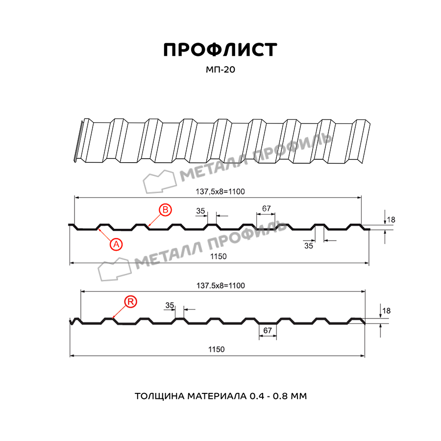Профиль МП-20 имеет толщину 0,5 мм, что обеспечивает прочность и долговечность материала. Он изготовлен из металла высокого качества, что гарантирует его устойчивость к коррозии и воздействию атмосферных условий.